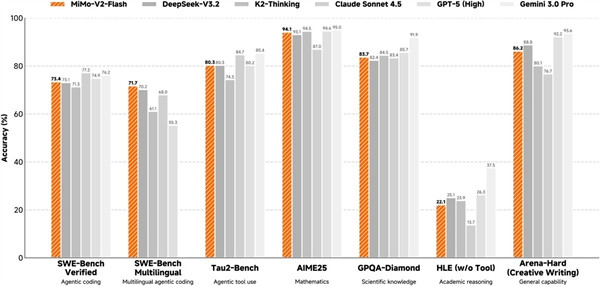 在多项综合基准测试中,小米MiMo-V2-Flash表现媲美DeepSeek-V3.2。